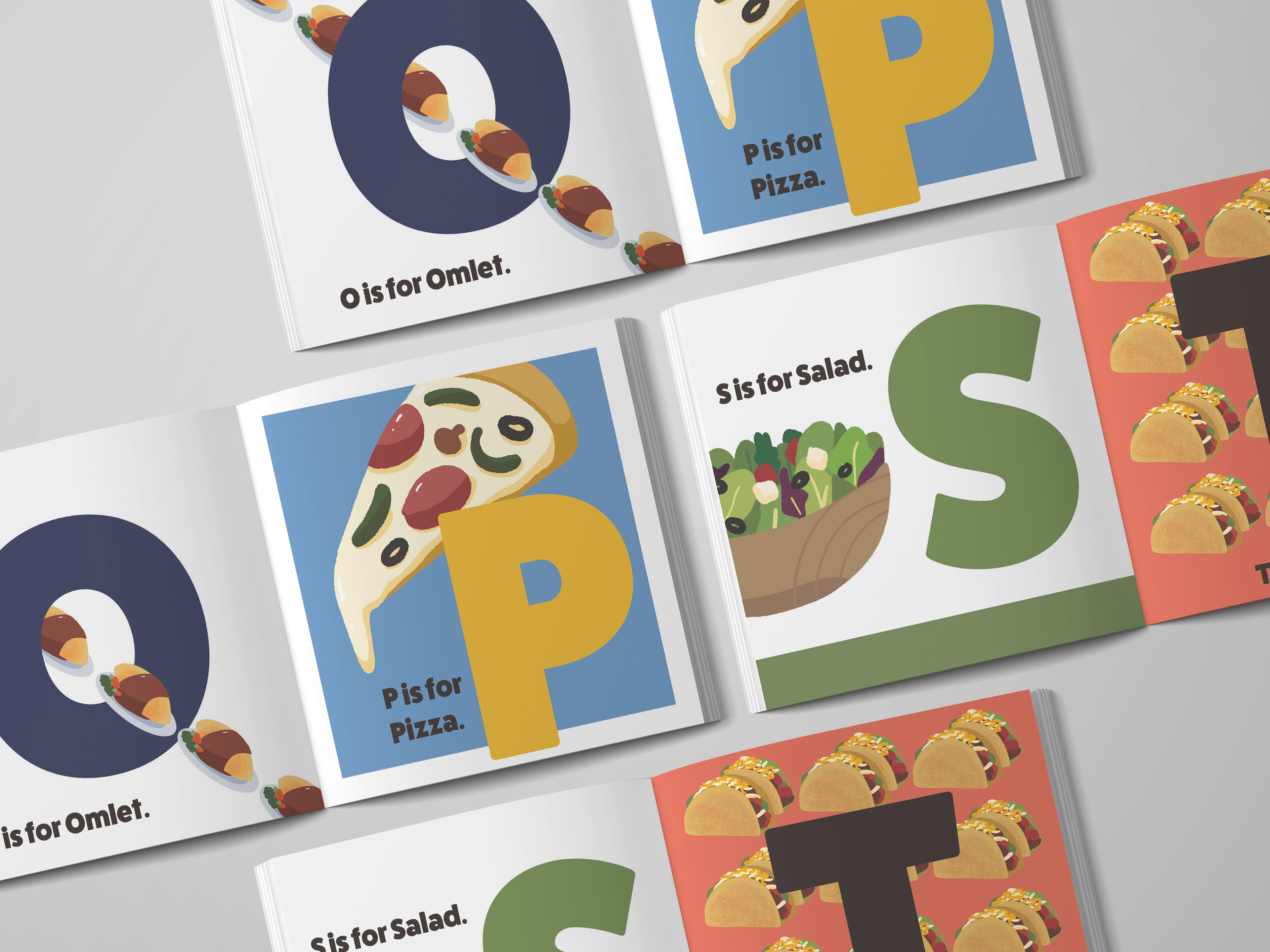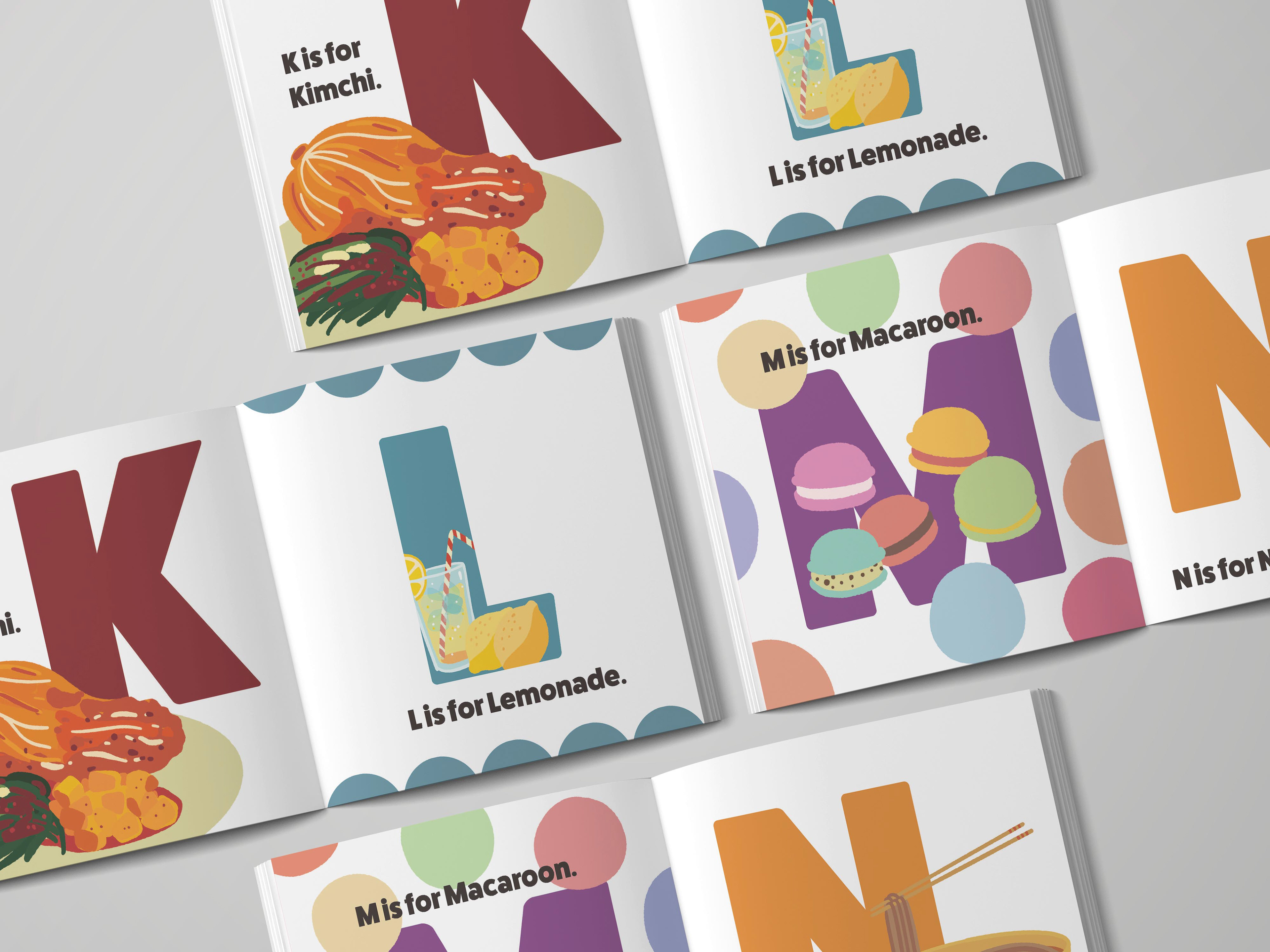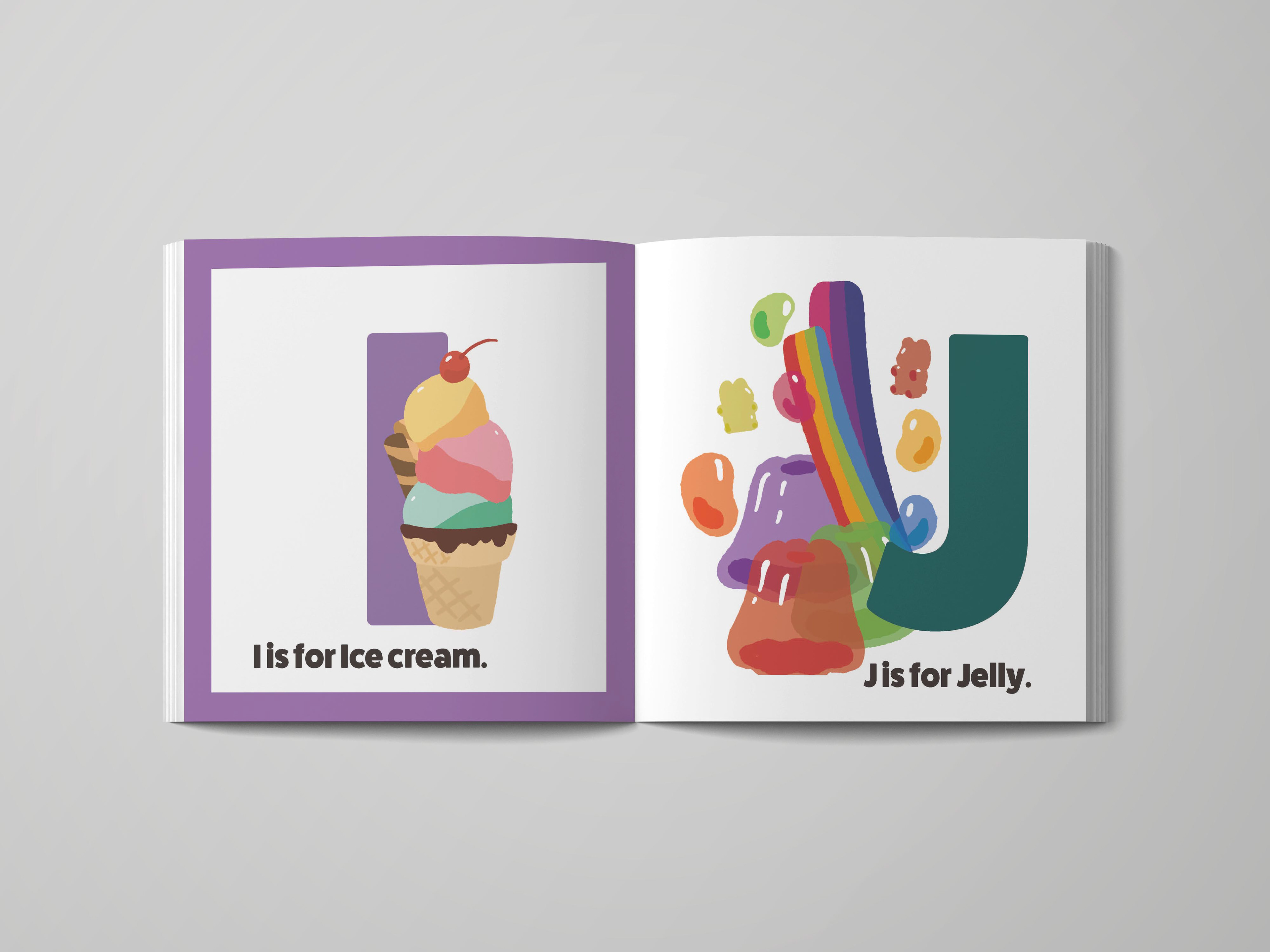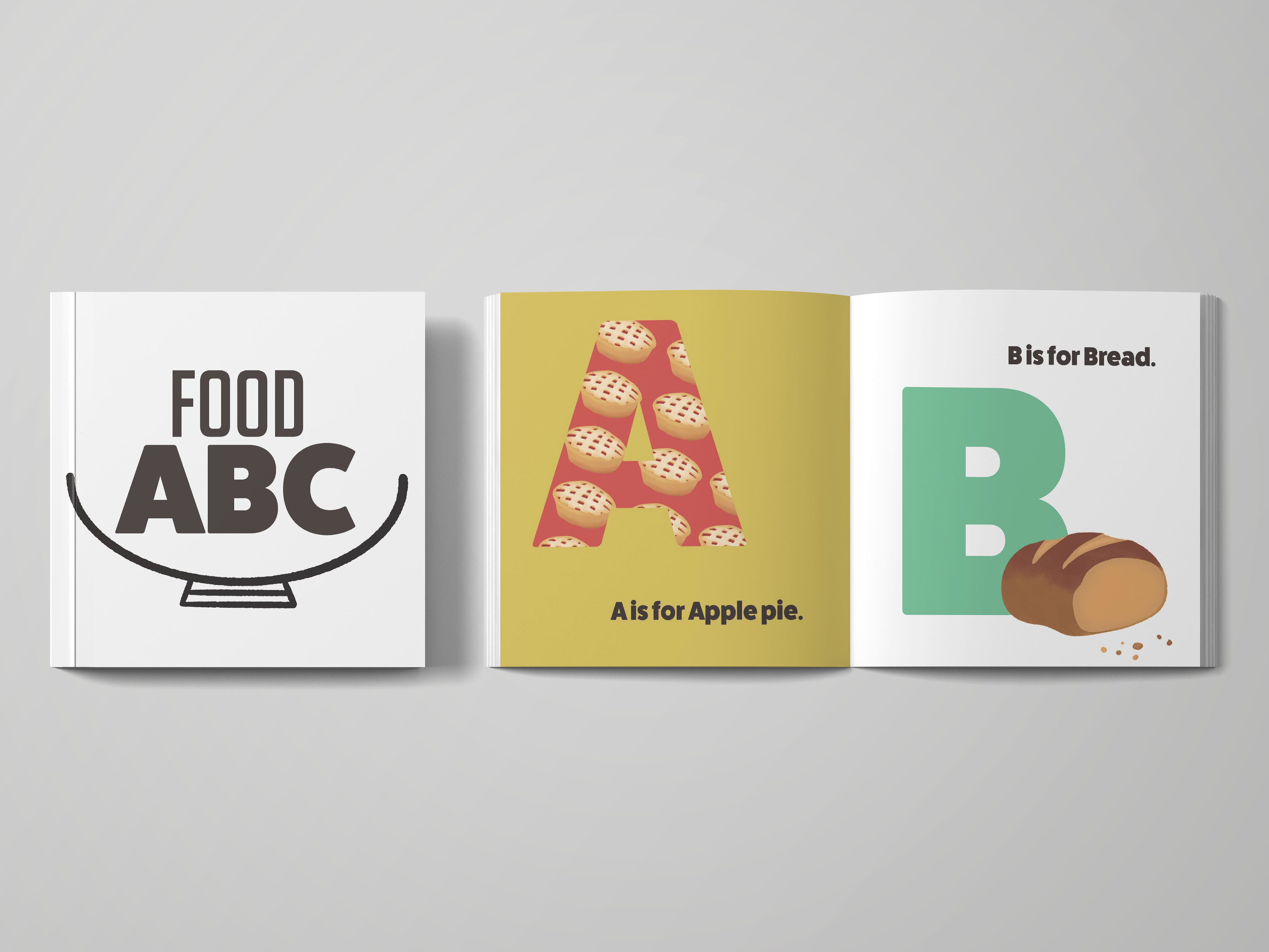 A self-initiated illustrated alphabet book featuring food-themed visuals from A–Z.