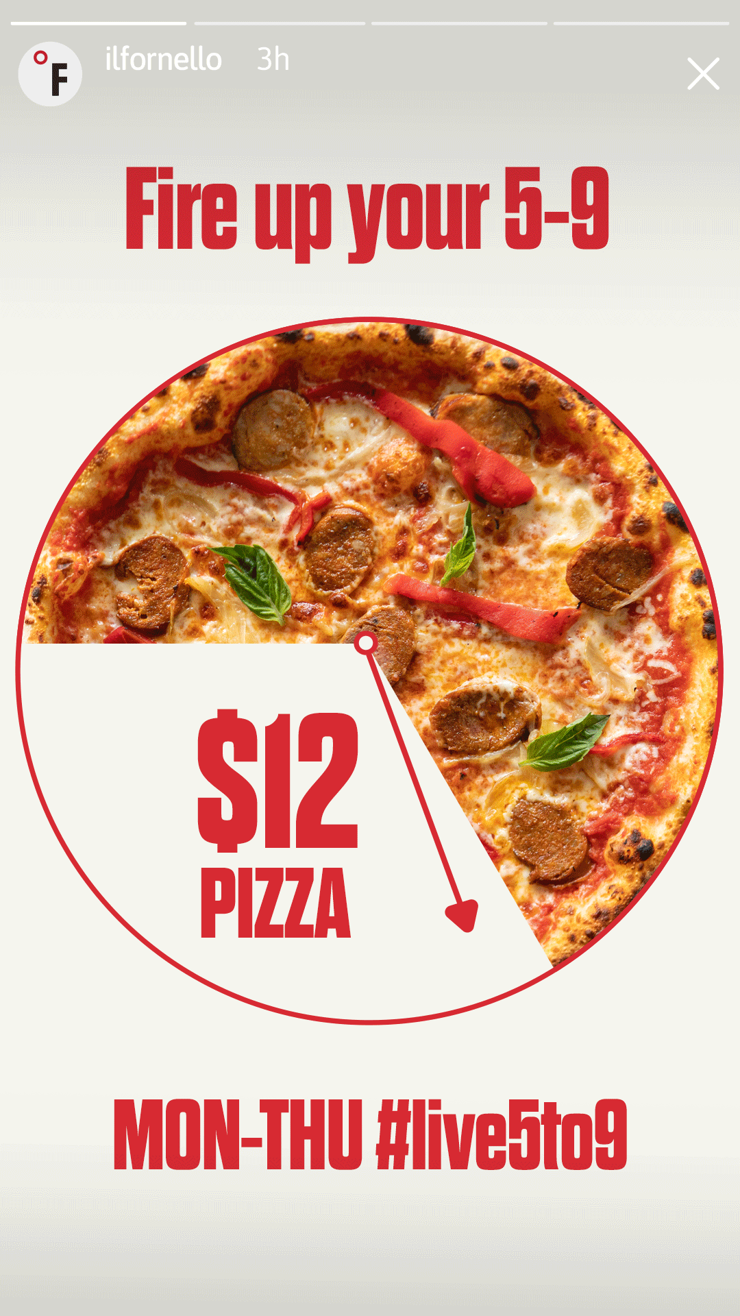 Created a motion graphic illustration of a pizza as a clock to emphasize the time-based promotion